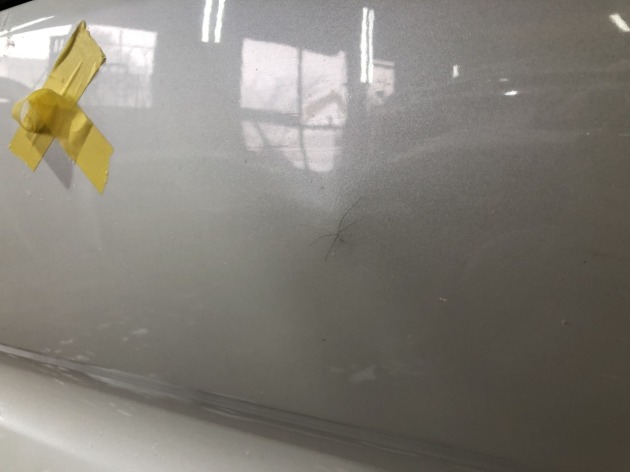 リアバンパーを当てた際に出来る一般的な凹みの他に・・・当てた衝撃でリアバンパーが押された時に、バンパー裏の何かに当たって、凸みが出来ています(出っ張っています)。