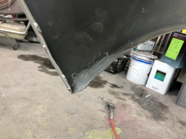 そして変形箇所(内部骨格のバンパーホースメントに当たって押し出された部分)は、熱処理をして平にし、下地作り(パテ成形)をします。
