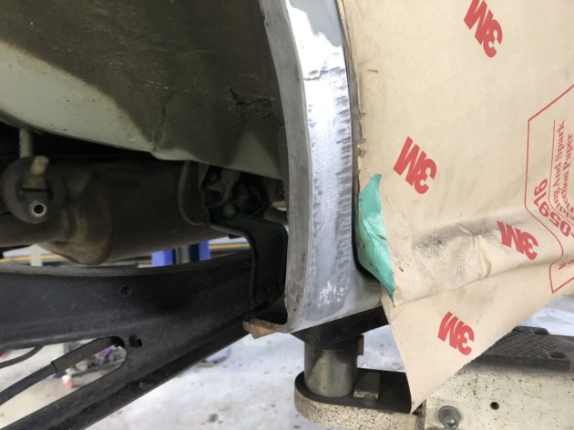 続いて左リアフェンダーも、サビている所をカットして新しい鉄板を溶接します。