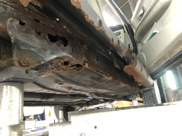ボディ下回りは、足廻りの取り付けフレームが腐食しています。また、ステップパネルの下側パネルが(腐食侵攻が酷く)無くなってしまっている状態でした。