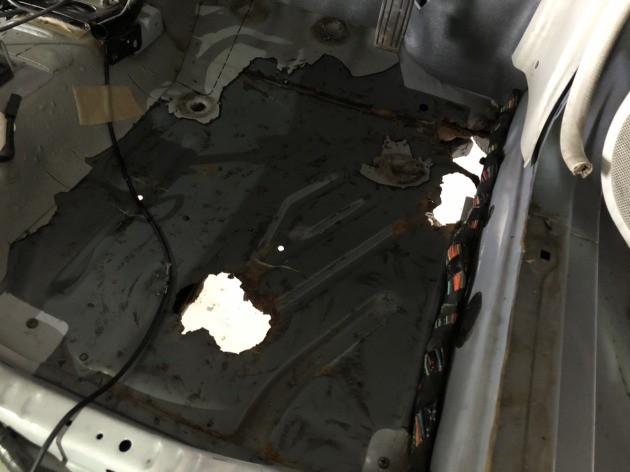 まずは、座席を取り外し→フロアマットをめくって→フロアのサビ腐食状態・穴開き状態を確認します。