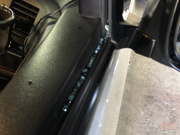 まずは、、、運転席ドアの内張りを外してから、ドアサッシやドアガラス根元に残っているガラス片を窓枠ゴムごと取り除き、掃除します。