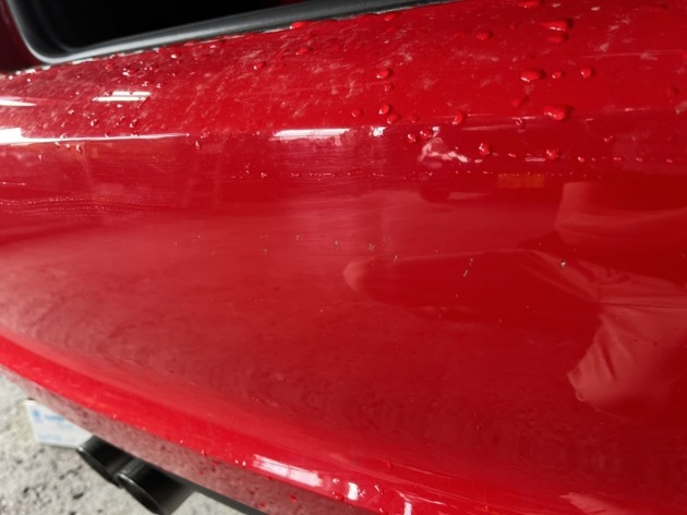 それと、、、リアバンパーアンダーカバーに、縁石に引っ掛けたような傷が付いています。このアンダーカバーについては、ザラザラした艶消し素材なので・・・全く同じには直らない事から、本来は交換した方が良いです。その為、交換をご提案いたしましたが、、、今回は、オーナーさんのご希望で、似た雰囲気になるよう修理して直す事になりました。