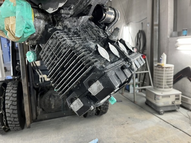エンジンを吊し上げて、、、とりあえず、表面の油分をしっかり落とします。バイクのエンジンといえども、かなり重たいので大変です。