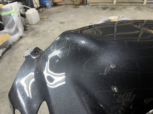リアカウルは右側のGSX1300Rステッカーが貼ってある付近に傷があります。ステッカーを剥がせば綺麗に下地処理・塗装までを行えますが、こちらのステッカーは廃盤で同じ物が無いようです。そのため今回は、タッチアップ補修と磨きで対応する事になりました。