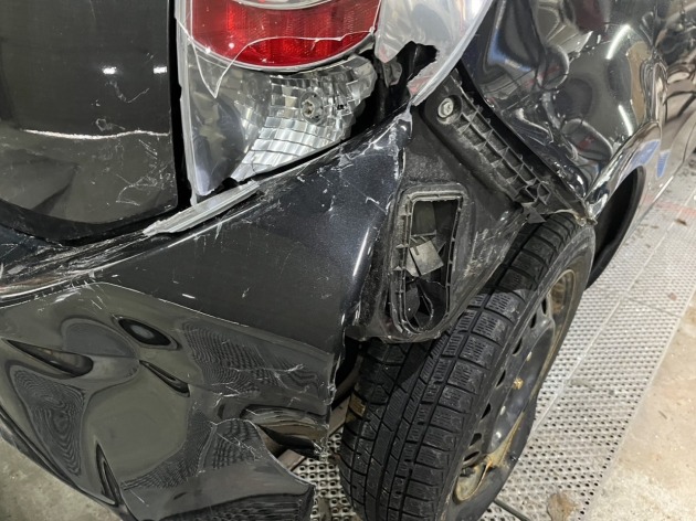右後ろ側から追突されたようで、リアバンパーは割れて一部無くなっています。