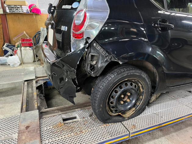 右後ろから追突事故に遭ったトヨタアクアがロードサービスで入庫