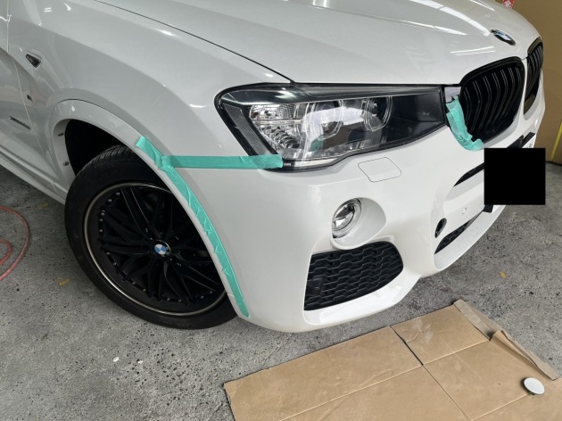 BMW X3がご来店です。フロントバンパーにガリ傷が付いてしまったそうで、『部分修理でいいので早くして欲しい』とのご相談をいただきました。 『今すぐお車をお預かりできるのであれば、一泊二日のクイック修