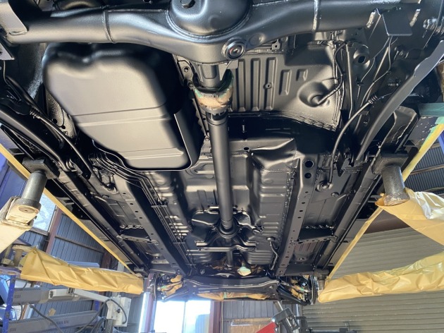 マフラーも外してマスキングし、アンダーコートの施工準備完了です。