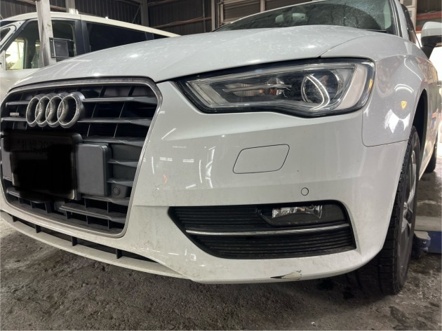 アウディA3の少し損傷したフロントバンパー左下部を部分的に修理