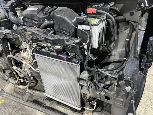 ホンダN-BOXがレッカー入庫です。 スリップして除雪でできた道路脇の雪山に衝突した衝撃でラジエーターが破損し、クーラント液(冷却水)がじゃじゃ漏れしたようです。 パッと見は大した事なさそうですが、、