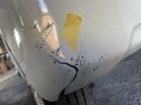まずはボンドを少し削り落としてみましたが綺麗には取れない状態でしたので・・・フロントバンパーとフロントフェンダーを塗装修理する事になりました。