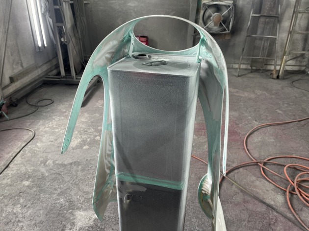その後、カウル全面を研いで塗装しますが、、、ここもオーナーさんの塗装の拘りとして、カウル裏側の黒いネット柄に塗装ミストが付着するのは良くないとの裏地の美学で、裏側をしっかりマスキングしてから塗装します。