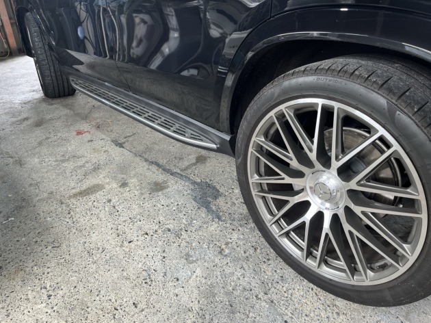 ピッカピカなブラックボディのメルセデスベンツGLSが入庫です。 サイドステップとリアバンパーの素地部分をシボ取りしてボディ同色塗装ご依頼を承りました。 まずは施工するパーツをバラバラに分解して、作業開