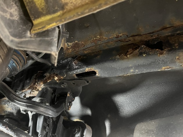 自動車整備工場さんで『手をつけたら大変な事になる』となった理由は、下回りフレームのサビ腐食が結構進んでいて複数箇所に穴も空いているようで・・・それらのサビ穴をアルミテープで塞いでいるような状態だった為です。