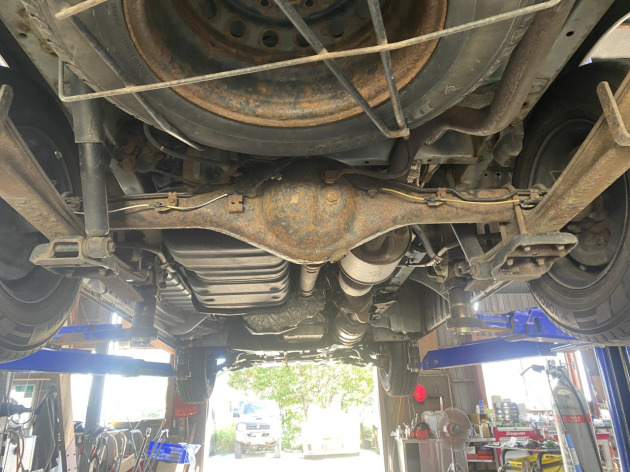 トヨタハイエース200系のユーザー車検代行ご依頼をいただきました。 まずはリフトに上げ下回りや足回りのチェックをします。 サビこそはありますが、不具合箇所も無く良い状態でした。 エンジンオイルとフィル