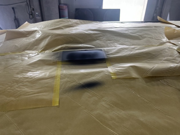 ダイハツタントのルーフにできた一つの大きめなサビの修理依頼承りました。 真ん中後方にぶちぶちと。 オーナーさんも自分達は見えないので部分修理で良いとの事なので作業スタートします。 木の実や鳥フンの付着