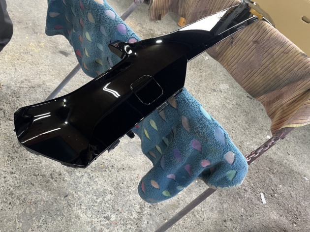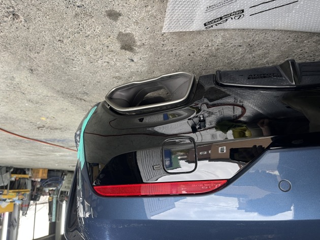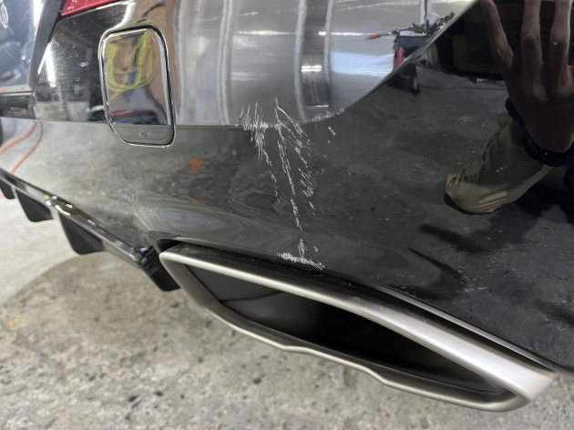 幸いリアバンパー本体(ボディカラー部分)の損傷は無く、リアバンパーボトム(グロスブラックに塗り分け塗装されている部分)だけの修理で済みそうです。