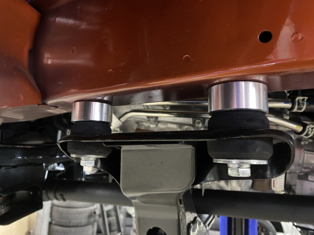 リフトアップに伴いプロペラシャフト等に負荷が掛からないようにフロントメンバー、ミッションマウント、リアデフステーを付属品を使用し取り付け位置を下げました。