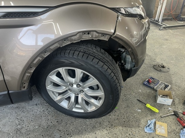 レンジローバーイヴォークのフロントバンパー板金塗装修理ご依頼いただきました。 フロントバンパーのサイド面(フェンダーアーチモール近く)に1ヶ所、小さめですが塗装欠け傷がついてしまったようです。 まずは