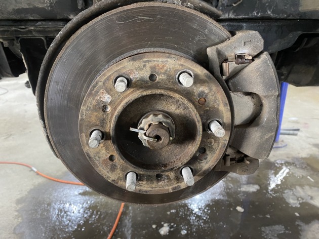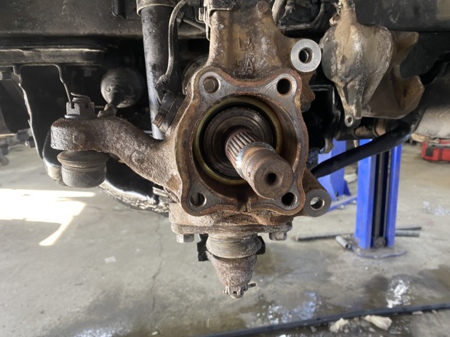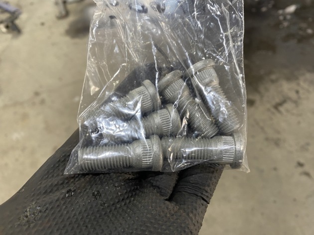 ハイエースハブボルト折れてハブボルト交換! 2026年1月30日 トヨタハイエース、ハブボルト交換のご依頼頂きました。スペーサー装着時に締め過ぎて折れた様です。ハブボルト交換の為にハブナックルからハブ周りを取り外します。新品のハブボルトを用意しました、折れてないハブボルトにも不安が残るので全交換します。古いハブボルトを打ち抜き、新しいハブボルトに入れ替えました。ハブボルト交換後にハブナックルにハブ周りを組み付け作業完了です。これで不安無く冬道も走れますね。この度はハブボルト交換依頼ありがとうございました。