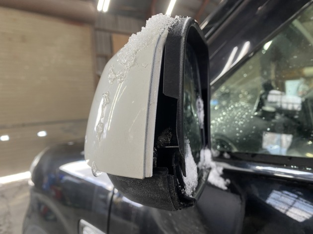 ダイハツキャストのドアミラー交換のご依頼頂きました。 接触してドアミラーの外枠を割ってしまった様です。 ミラー機能に問題はありませんが、後方確認時に破損箇所が目に入るので気になりますね。 同色カバーの