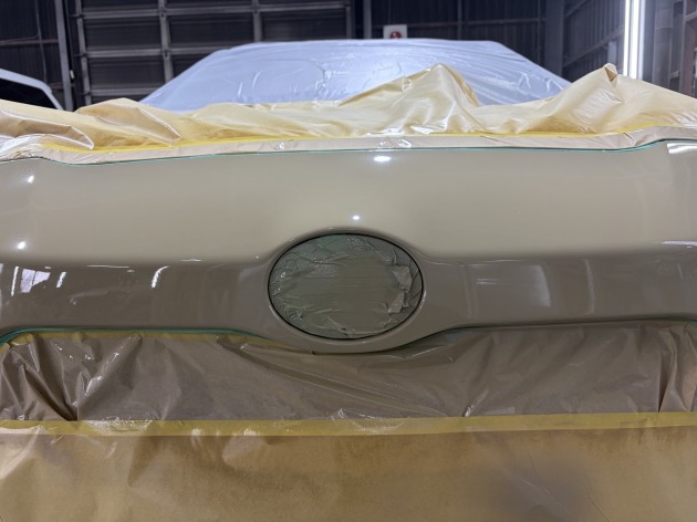 変形を修正して塗装面も丁寧に整えた後、調色した塗料でフロントバンパー上部のみを部分的に塗装します。