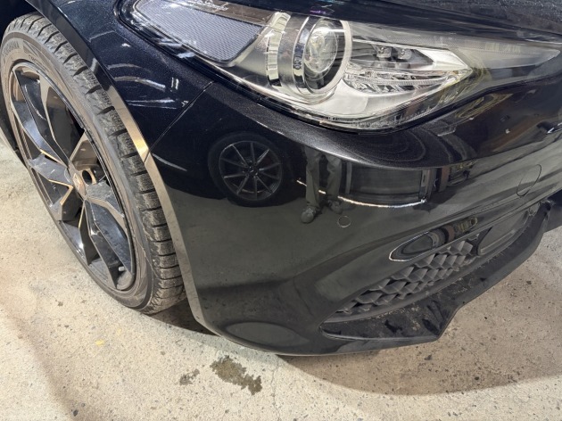 アルファロメオジュリアのもげて外れたフロントバンパーを簡易接着修理