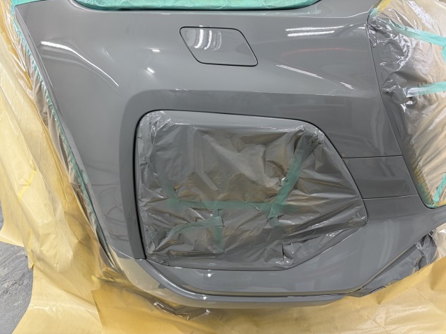 お車をお預かりして修理開始し、フロントグリルとフォグランプベゼルに新たな傷を増やさないようにマスキングで保護して作業します。