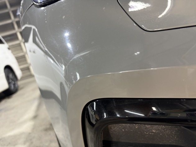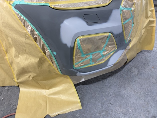 オーナーさんと打ち合わせして、フロントバンパー本体の歪みと塗装剥がれ個所だけを板金塗装する(フロントグリルやフォグランプベゼルにも少し傷がついていますが、それらは修理しない)事に決まりました。