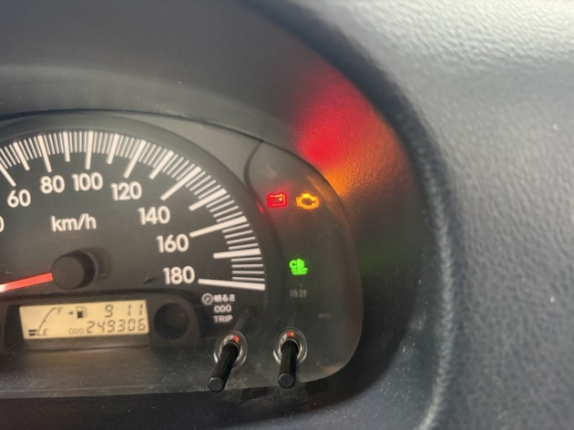 ブースターを繋いでエンジンを掛けてみると、バッテリーマークが点灯してます。