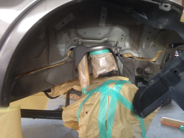 トヨタヴェルファイア30系前期がアンダーコート施工のご依頼で入庫しました。 まずはリフトに上げアンダーカバーの取り外しやサビ落としをします。 サビ除去後にマスキングを施します。 そしてタイヤハウスや下