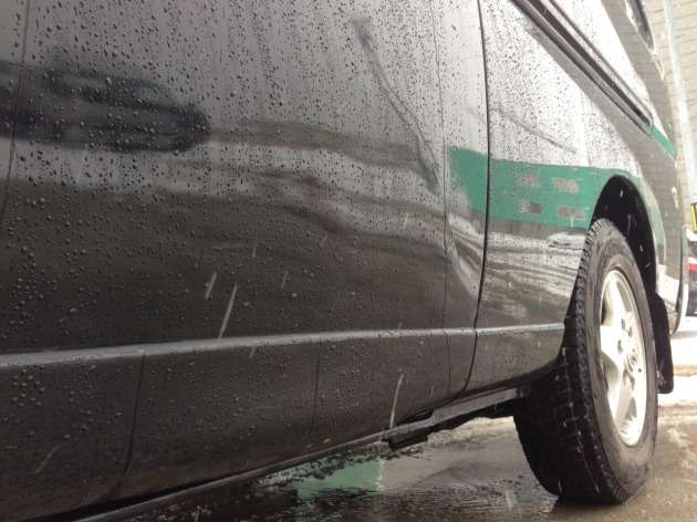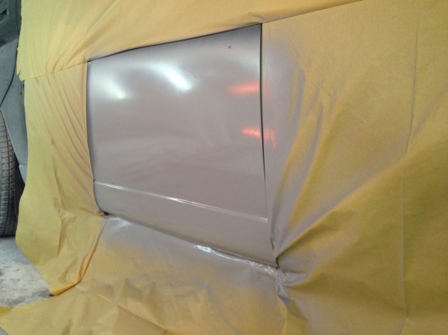 日産キャラバン過去修復歴有か!左スライドドア下部凹みパテ割れ板金修理