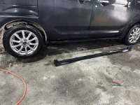 三菱ekワゴン入庫です! 助手席側のステップパネル雪山に乗り上げた時に凹ませてしまい修理塗装依頼! 早速お預かりして作業開始していきます! 大きな損傷では無いので、軽く引き出し作業してパテ/サフェーサ