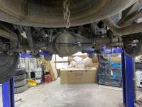 トヨタハイエース200系のユーザー車検代行ご依頼をいただきました。 まずはリフトに上げ下回りや足回りのチェックをします。 サビこそはありますが、不具合箇所も無く良い状態でした。 エンジンオイルとフィル