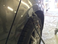 日産F50シーマ ボンネットいたずら傷の板金修理に続きこちらも入庫です(^o^)/ ゴルフボール程の凹みが一個。 サイドステップが浮いて外れています。 バンパーやサイドステップの浮きだけでも調整して直