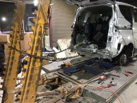 大ダメージ事故修理でお預かりしていますトヨタシエンタ 今回は骨格修正 パネル交換のご紹介です^ ^ 前回カロライナー(フレーム修正機)にセットしたシエンタ まずは寸法図を元にあら出しの引っ張り修正!