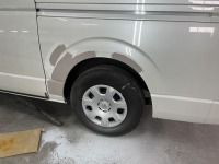 左リアフェンダーの傷・凹み修理ご依頼で、トヨタハイエース200系が入庫です。 早速、板金作業を進めていきます。 範囲は広めですが、幸いにも傷も凹みも軽度なので、スムーズにパテ成形を終えて下地までが完了
