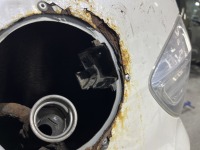 トヨタエスティマ 給油口のフタを閉めても飛び出てるので ちゃんと閉まるように修理してほしいという事で 開いてみたら可動部がもげてました。 溶接点付けもいいかもしれませんが、 可動するところが動かなくな