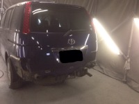 只今作業中のトヨタアイシス進行状況更新です! 左右の板金に続きボンネット、リアゲート(バックドア)の板金作業中です! リアゲート部の損傷がヒドくほぼ一面パテという状況です。。 前後バンパーに関しては飛