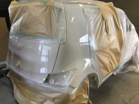 トヨタbB 塗装に入りました(^-^)/ まずは中塗り!リアフェンダーのみの作業であれば単品ブロックで中側と外側一気にと行けるのですが、今回ゲート(バックドア)もありますので2工程で仕上げていきます