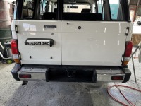 トヨタランドクルーザー76が入庫です。 リアゲートのリアガラス周辺箇所が錆びているため、新品リアゲートへの交換修理ご依頼をいただきました。 また、新品リアゲートのスペアタイヤキャリアを取付固定するボル