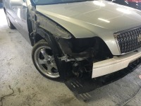 入庫中のトヨタ17マジェスタ。 自動車保険を使うか、自費で修理するか? リサイクルパーツ(中古部品)を探しつつお見積り! 分解して内部の損傷を確認して、金額を出したところ外装部品は全てリサイクルパーツ