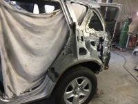 保険使用のトヨタRAV4 左側面全て交換しまして表面の塗装開始! その後組み付け作業となります。 細かい所ではありますが、ガラス窓枠の黒い所、実はシールと言うかテープを貼って艶消し黒を表現しているんで