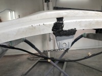 スピンドルグリルスタイルの社外フロントバンパーを装着したレクサスIS250が、その社外フロントバンパー取り付け・固定部分の損傷修理で入庫です。 フロントバンパー下側の固定ステーを取り付ける部分が(3箇