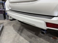 トヨタランドクルーザープラド のリヤバンパー修理をご依頼いただきました 小さいのだけど深いへこみでちょっと目立たなくしたいと プラドのリヤバンパーについている黒いステップガードも傷ついているのですが、