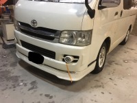 200系ハイエース入庫です! フロント周りぶつけてしまい保険を使っての修理! フロントバンパーとスポイラーが外れてしまい落ちかかっています ドアに関しては当たりは小さいですが全体的に張りが無くなりベコ