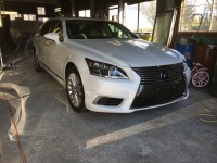 遠方からご来店ありがとうございます。 レクサスLS600hL フルカスタム車両 イメチェンドレスアップのご依頼です。 社外エアロのフロントバンパーと左右サイドステップ ブラックアウト塗装下部のみを ボ