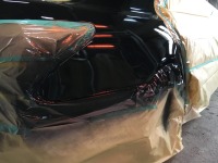 レクサスGS250/350 持ち込みリヤハーフスポイラーの塗り分け塗装依頼です。 メーカーによる説明書に塗り分け指定がありますので それを見本に作業します。 まず艶消しブラックを塗装します その後マス
