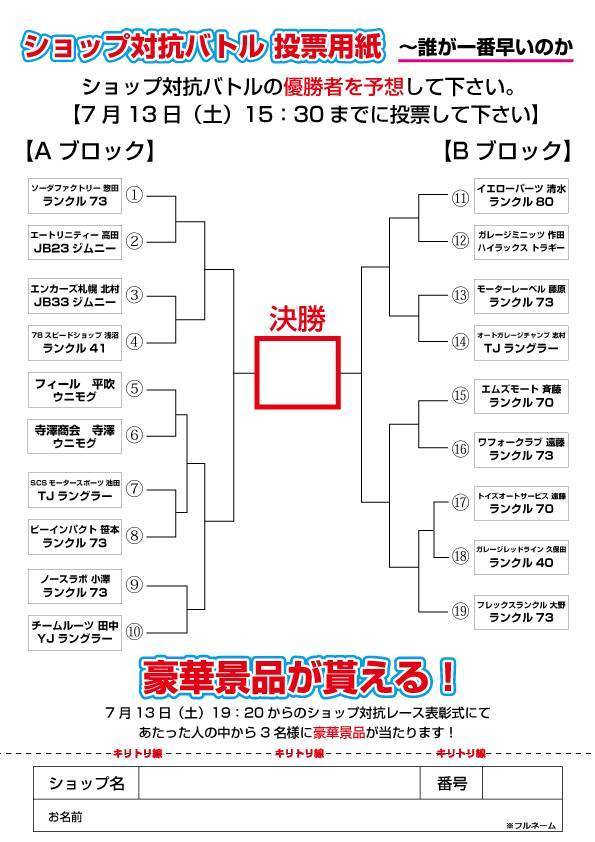 ショップ対抗レース組み合わせ発表 2019年7月8日 毎年大盛り上がりなショップ対抗レース!!各ショップの代表者がショップの威厳をかけてガチでレースをする!!見ていて面白いに決まってますよね〜!!!今年ももちろん優勝者を予想して当たった人の中から抽選で3名様に豪華景品当たっちゃいますよ〜!!13日(土)16:00開始